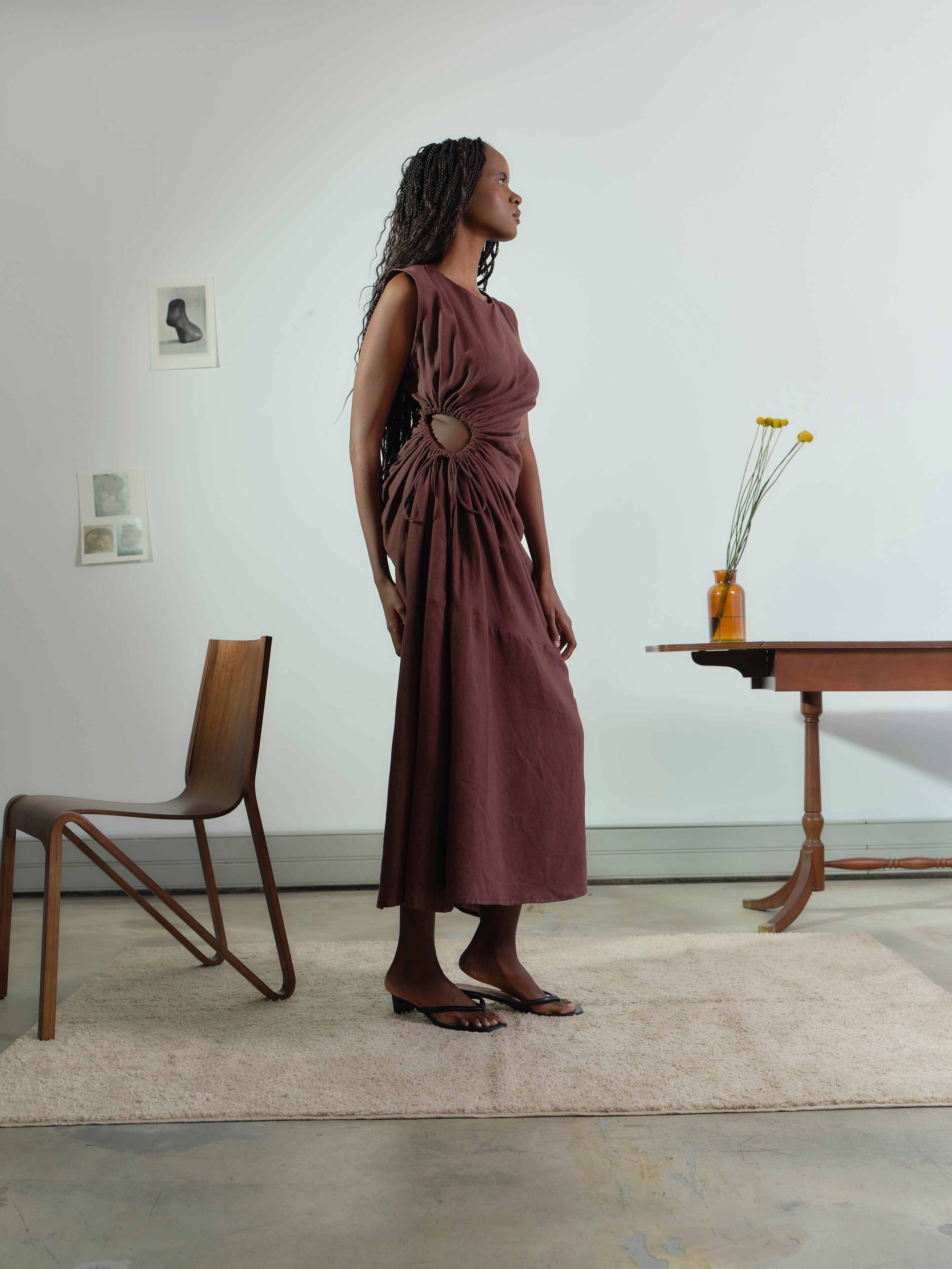 The Gathered Cut Out Dress is an aline silhouette with side cut out gathered detail. It is completed with a rounded neckline and back bow fastening.