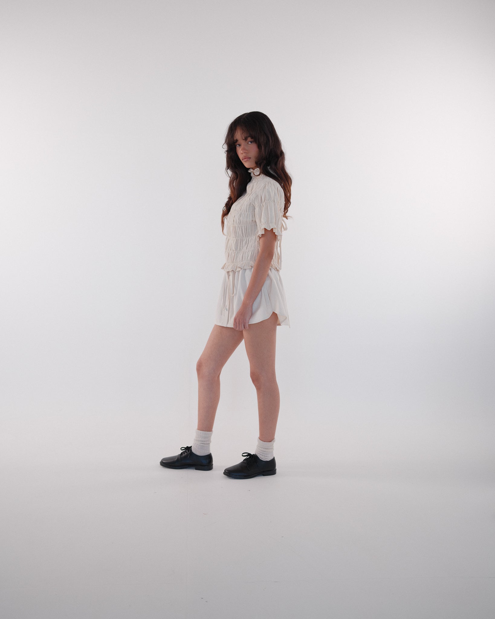 The Gathered Elastic Puff Sleeve Top is designed with a victorian neckline, puff sleeves and elasticated bodice. It is completed with three back ties.