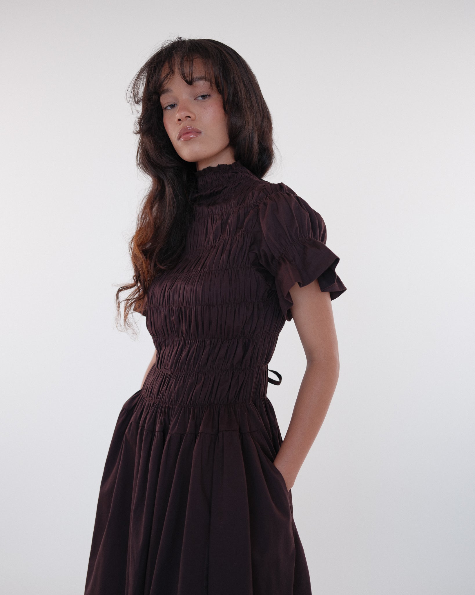 The Gathered Elastic Puff Sleeve Dress is designed with a victorian neckline, puff sleeves and elasticated bodice. Created with a front slit and gathered aline silhouette. It is completed with three back ties and side pockets.
