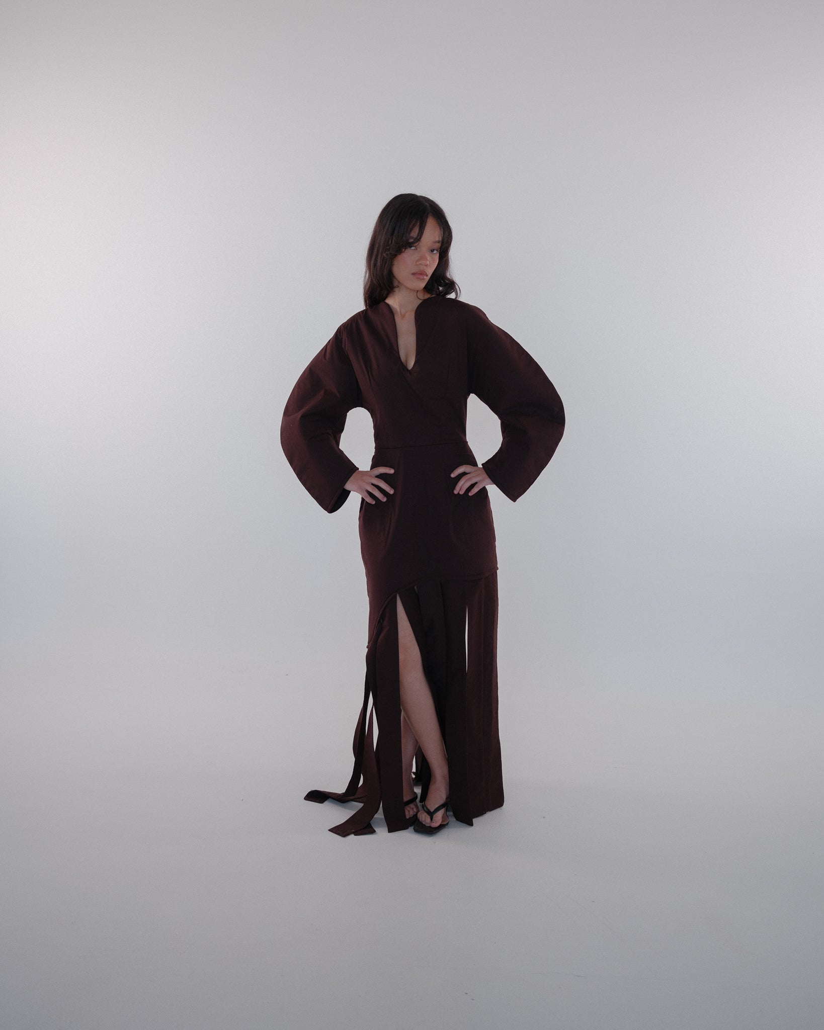 The Clay Pot Tassel Dress is designed with our signature clay pot neckline and sculptural sleeves. The entire dress is padded to create more structure and completed with our signature tassel detail