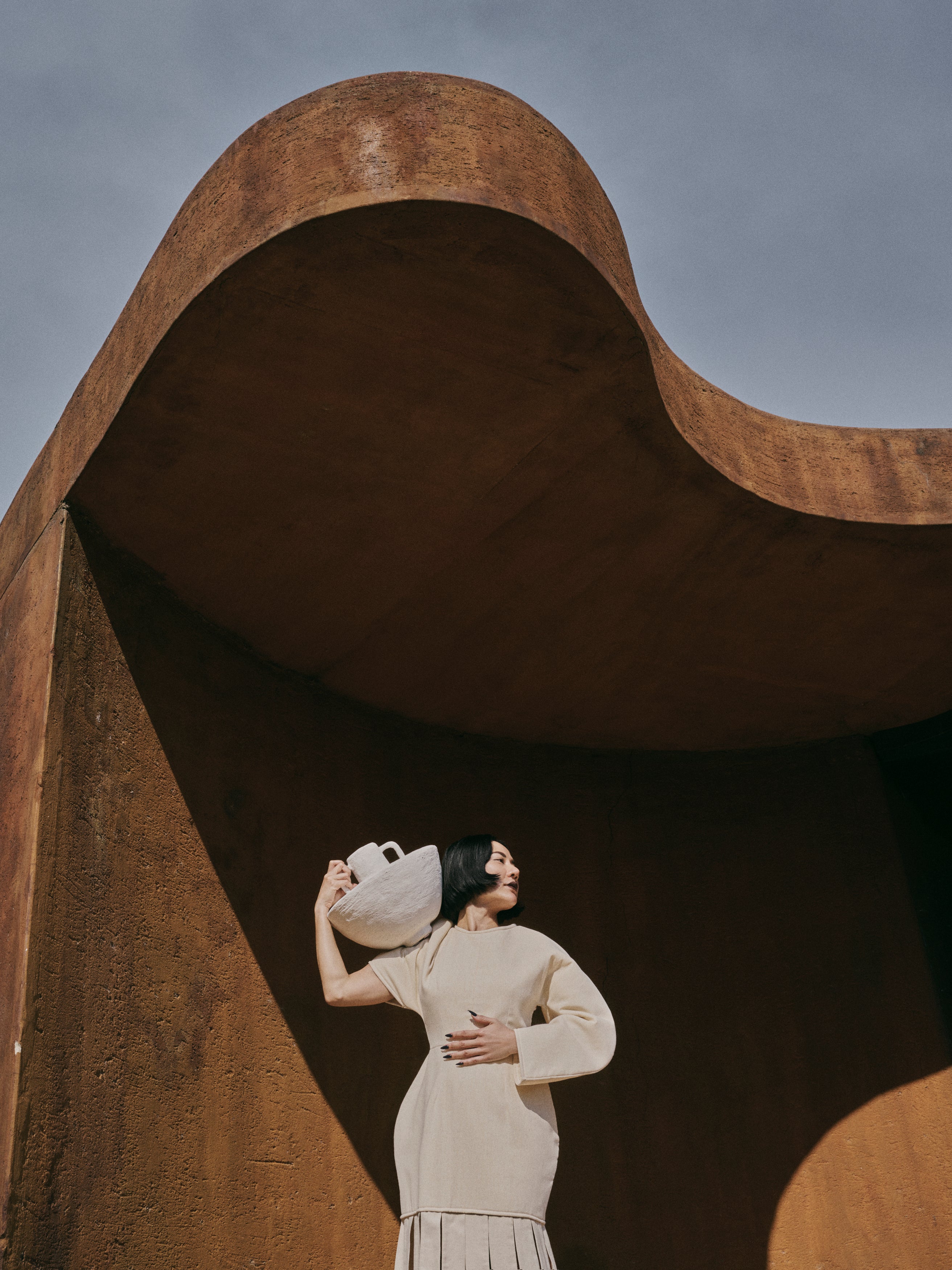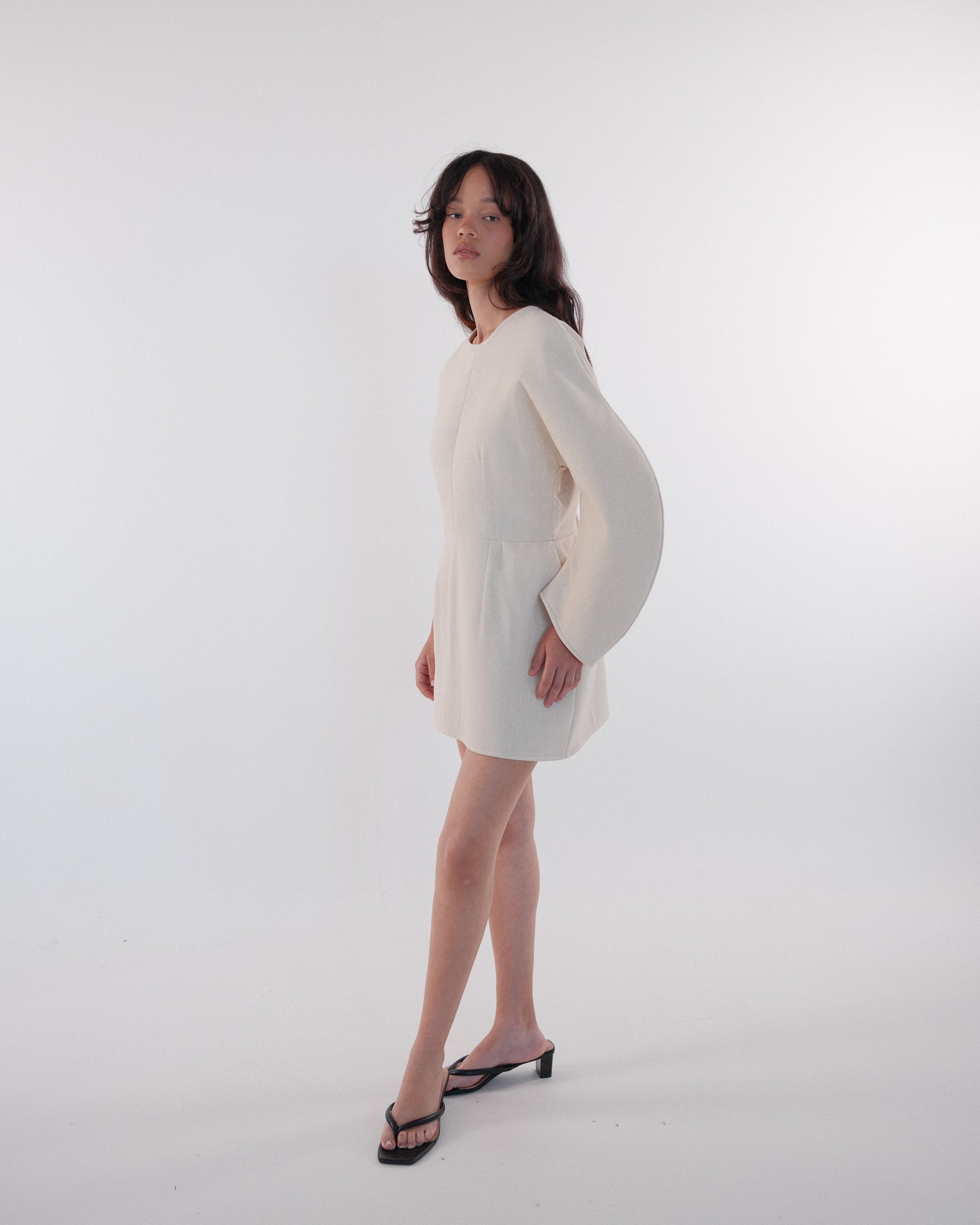 The Sculptural Mini Circle Dress is designed with a round neckline and semi fitted bodice. One sculptural sleeve and the other sleeveless. Makes for the perfect dinner date dress !