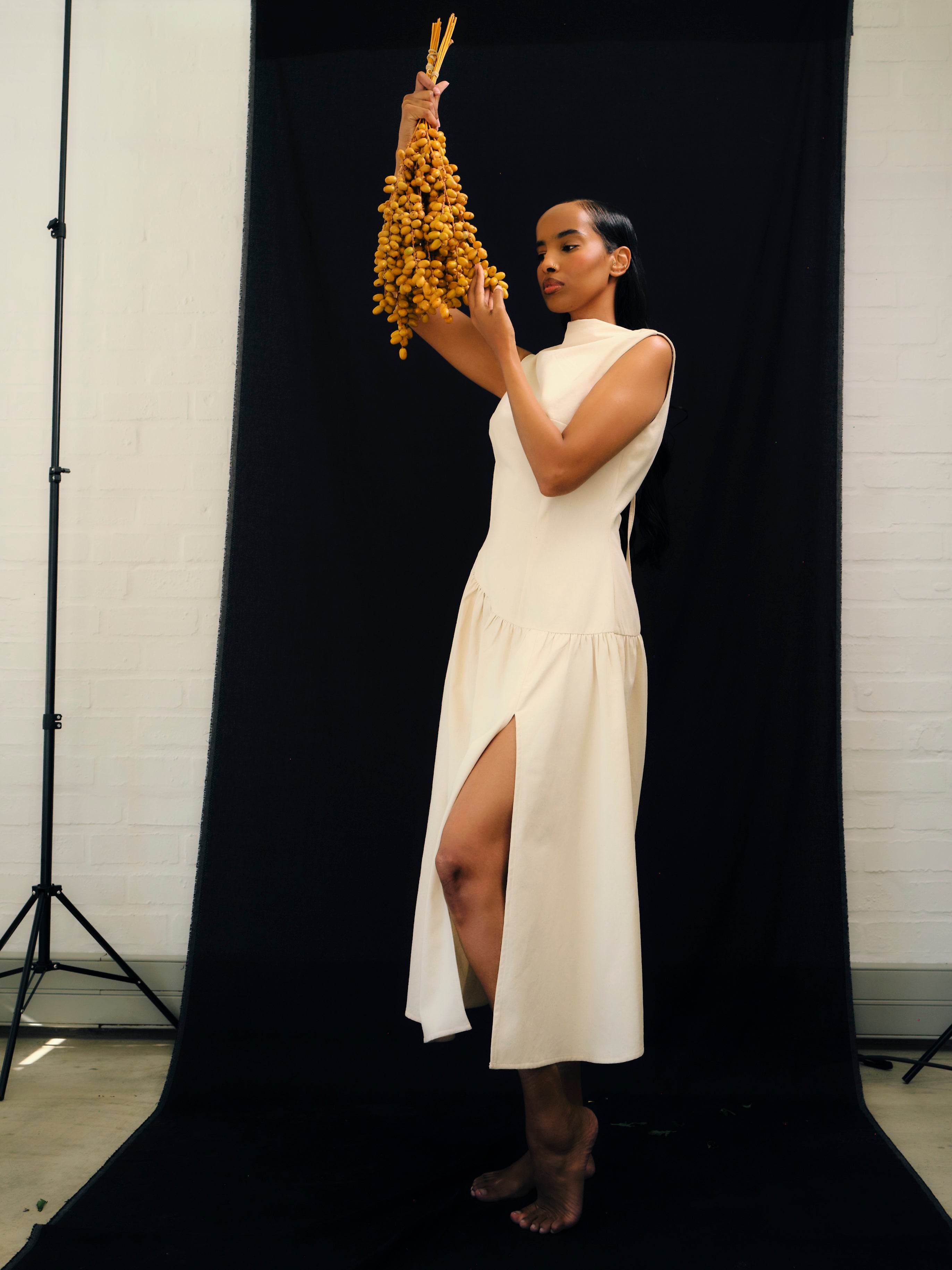 The Gathered Cut Out Dress is an aline silhouette with side cut out gathered detail. It is completed with a rounded neckline and back bow fastening.