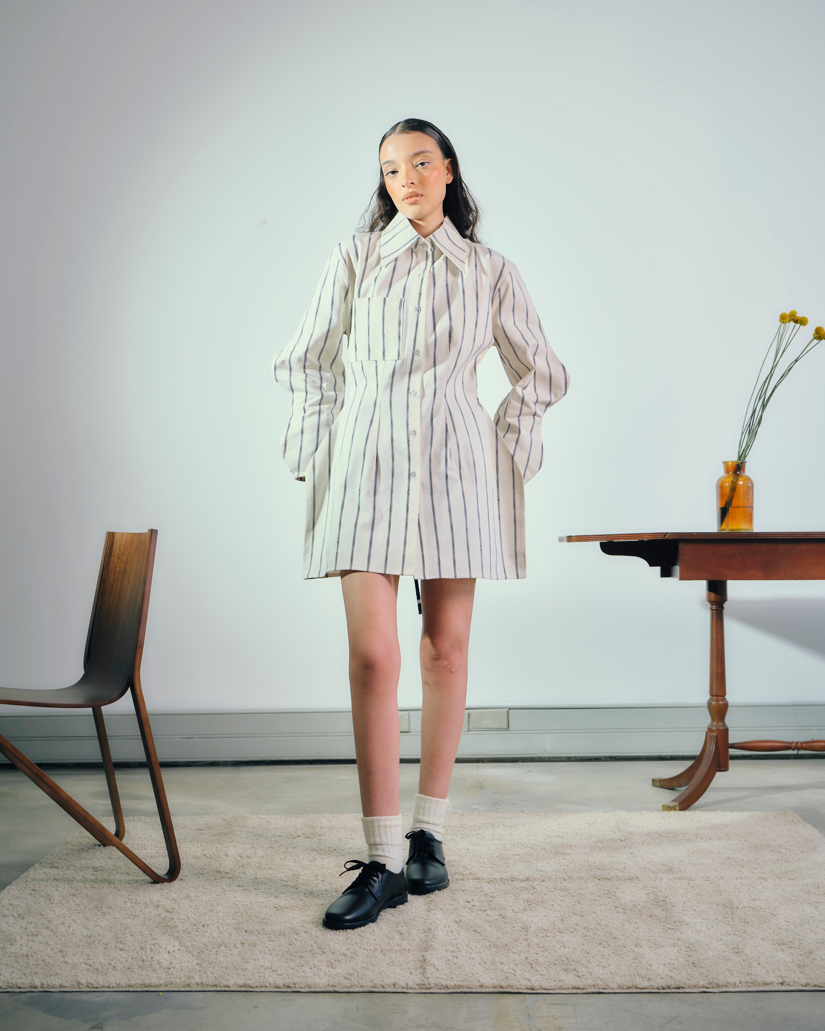 The Two Wave Sculptured Shirt Dress has a 70’s collar with front button stand fastening. Designed with our signature two wave sleeve and extended hip silhouette. It is completed with side pockets and front and back waist darts.